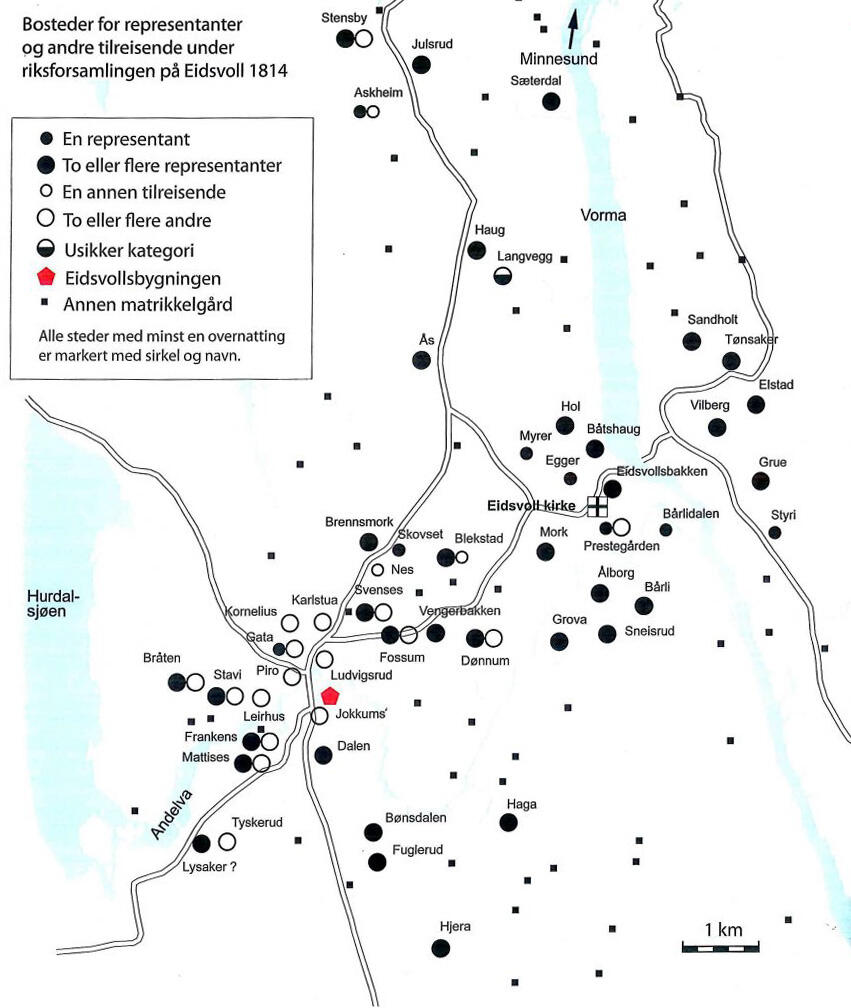 Her bodde de. Kart over bostedene der eidsvollsmenn og andre tilreisende bodde i april-mai 1814. Tegnet av Rune Borvik til Eli Fure: «Riksforsamlingen praktisk talt»,i Eli Fure og Knut Johannessen: Folk, fe og flagg på Eidsvoll i 1814, Oslo 2014: Riksarkivet, Riksarkivaren skriftserie 43, s. 66.