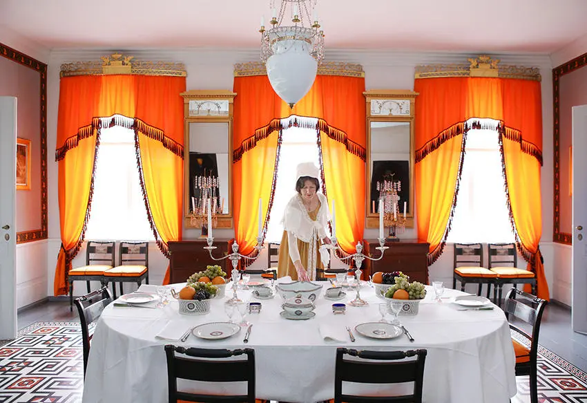 I denne omvisningen får dere høre om hva som skjedde her i 1814, men også hva slags liv herskapet og tjenerne levde på tidlig 1800-tall. Guiden vil møte dere i tidsriktig klær anno 1814, og omvisningen går fra herskapelige praktstuer til enkle forhold hos tjenerne i kjelleretasjen. De store sosiale forskjellene mellom folk trer tydelig fram. – Men også et herskapelig liv hadde sine sorger og bekymringer.