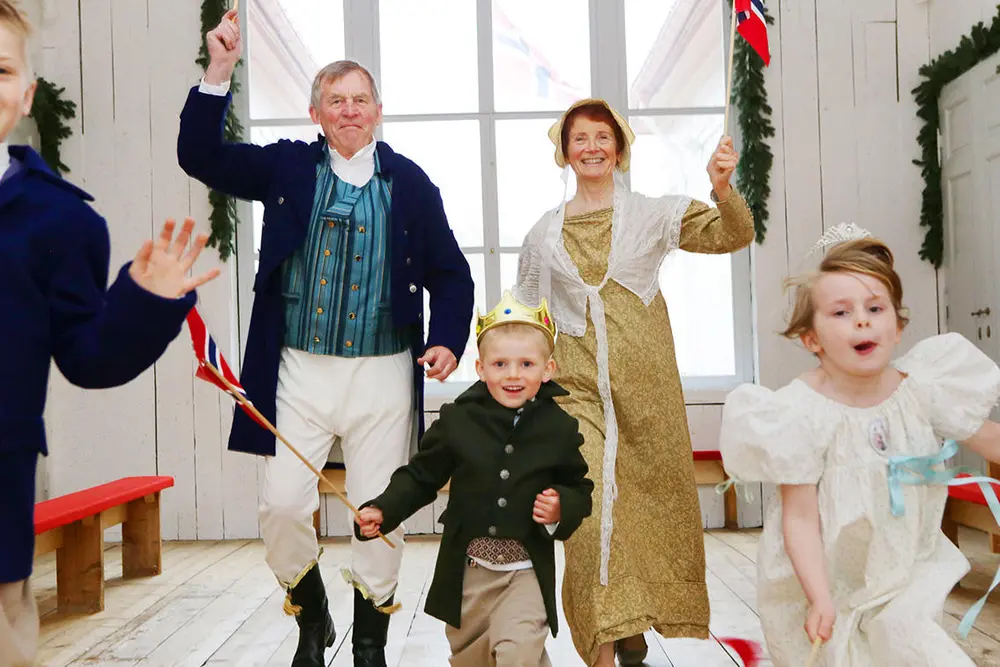 Ta med familien eller vennegjengen, ta med voksne og barn til Eidsvollsbygningen. Kanskje bestemor har bursdag og vil ta med sine nærmeste på en annerledes feiring? Vi tar dere med på en spennende tur i det ærverdige gamle huset. Vi kler dere ut som prinser, adjutanter, eidsvollsmenn og tjenerskap. Dere får se de flotte stuene, dører forkledd som bokhyller og tjenertrapper skjult inne i veggen. Denne omvisningen passer for grupper der det både er barn, ungdom og voksne med – vi tilpasser gruppa!