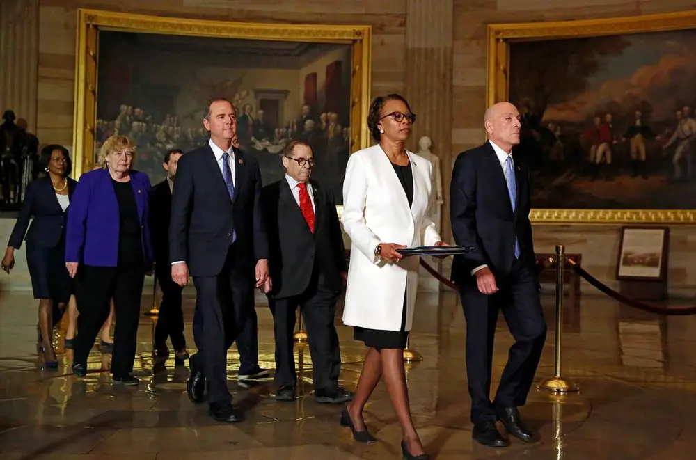 Medlemmer av Representantenes hus leverer riksrettstevningen av president Trump i januar 2020. På vei inn i Senatet passerer de John Trumbulls bilde The Declaration of Independence. Foto Scanpix.