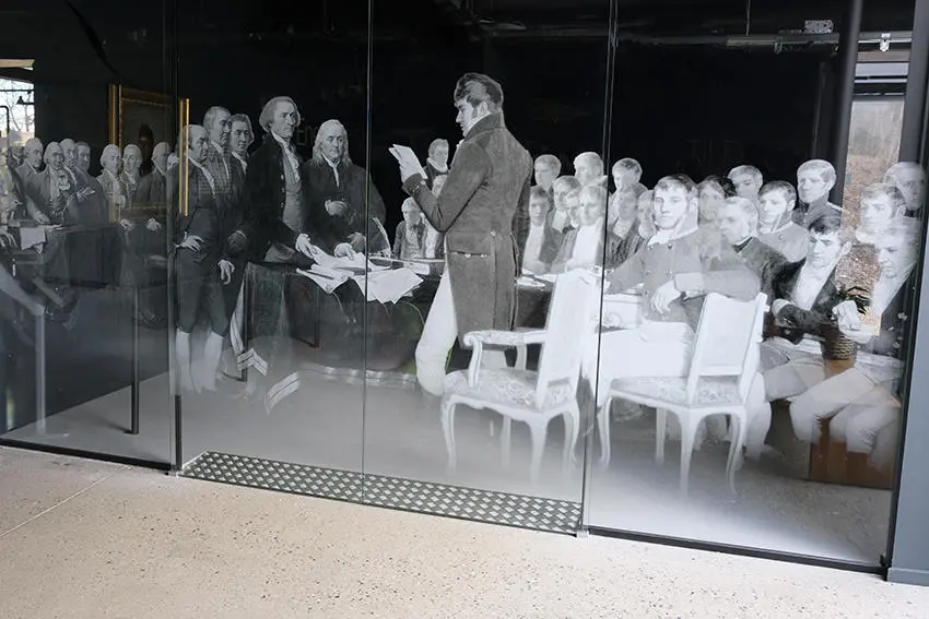 Sammenstillingen av Trumbulls og Wergelands bilder er en måte å framheve de idéhistoriske båndene mellom disse to forsamlingene. På mange måter er den amerikanske erklæringen om uavhengighet begynnelsen på den æraen vi kaller revolusjonstiden. Dette er en tid der tradisjonelle maktformer og styreformer, som eneveldet, utfordres av nye ideer om et mer rettferdig styresett, basert på folkesuverenitet, maktfordeling og liberale prinsipper om menneskenes og borgernes rettigheter. Og det er også i denne æraen at den norske grunnloven blir skrevet her på Eidsvoll.
