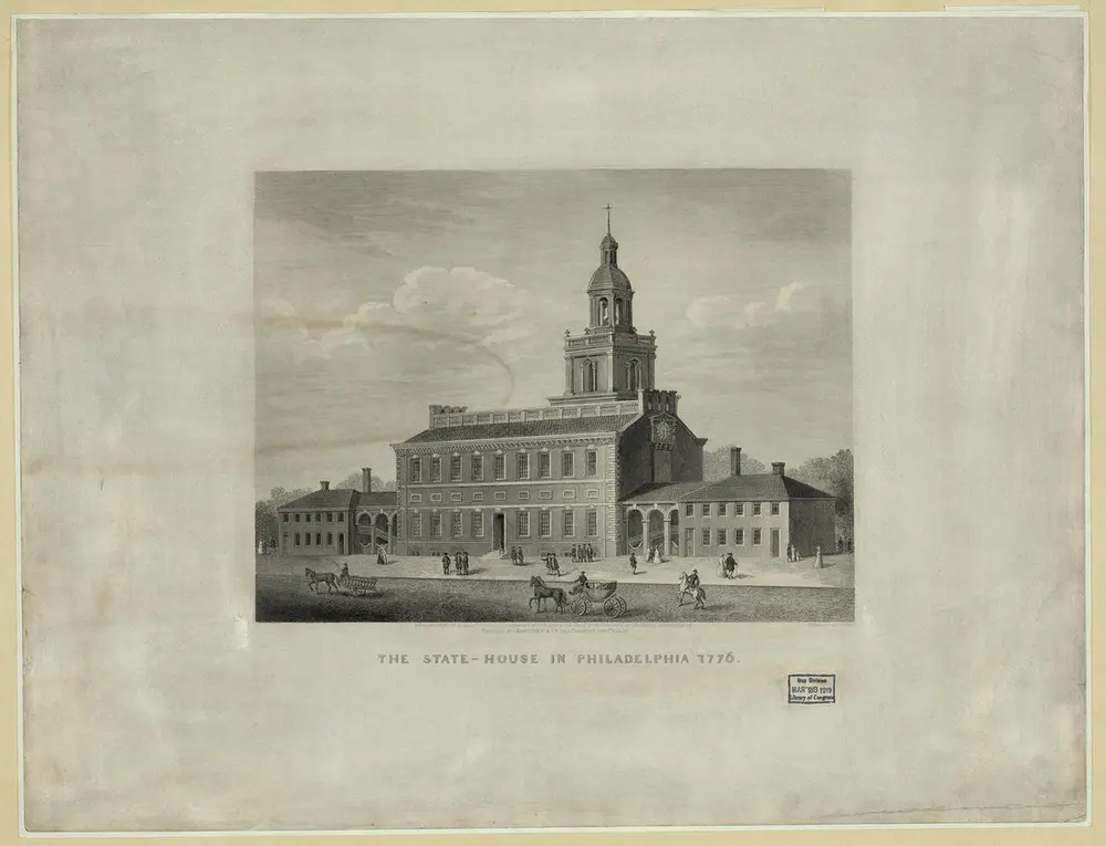 Independence Hall i Philadelphia. Gravering av J. Serz etter tegning fra 1776. Library of Congress