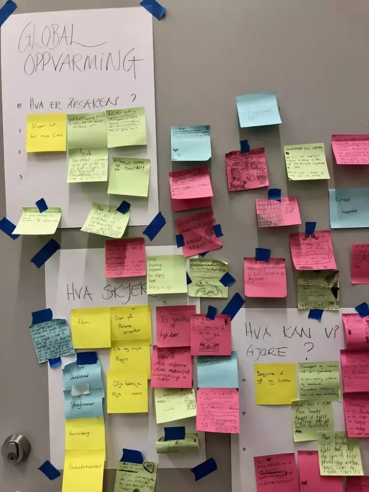 Elevene skrev ned på Post-it lapper alt hva de visste om temaet. De fikk tre nøkkelspørsmål: