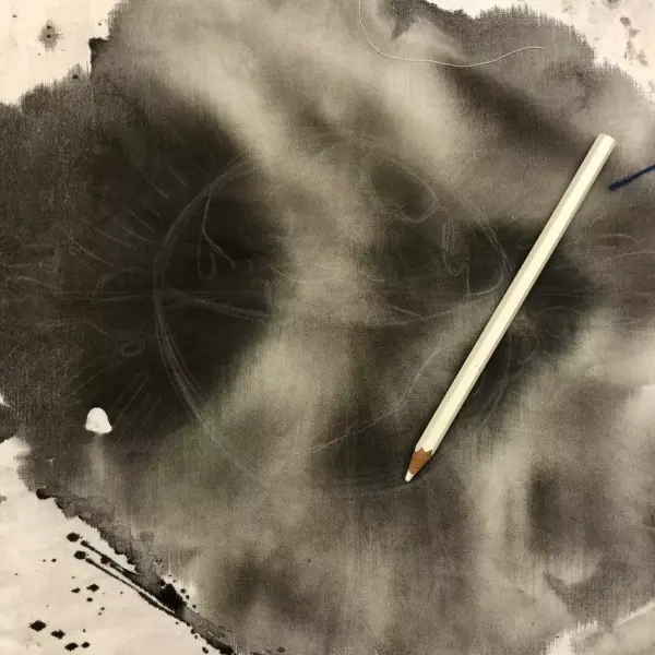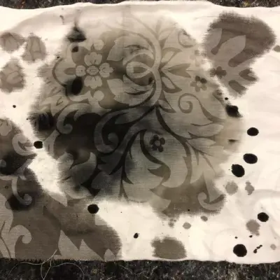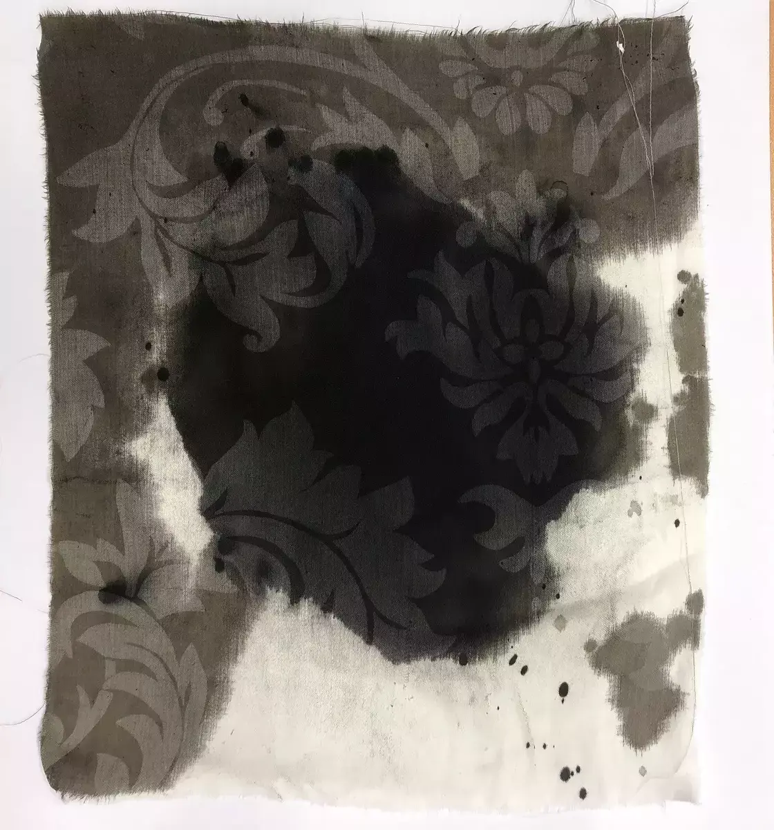 Tekstilen er et gjenbrukt dynetrekk. Alle tekstilbitene i størrelse 30x30 cm ble dyppet i blekk og malt på. Det sorte blekket fikk lett tankene over på olje, røyk og forurensning.
