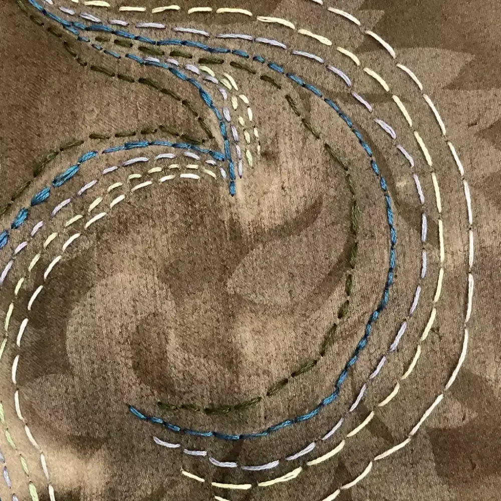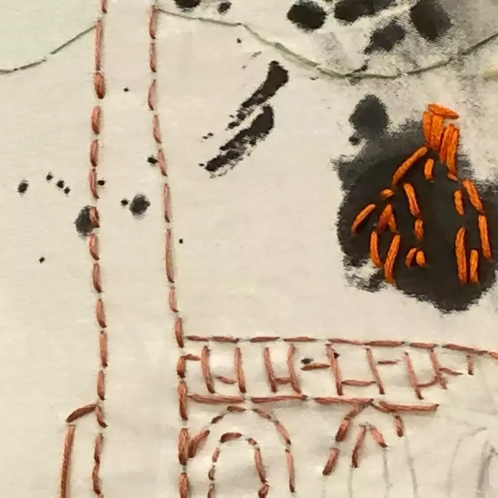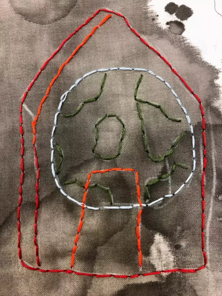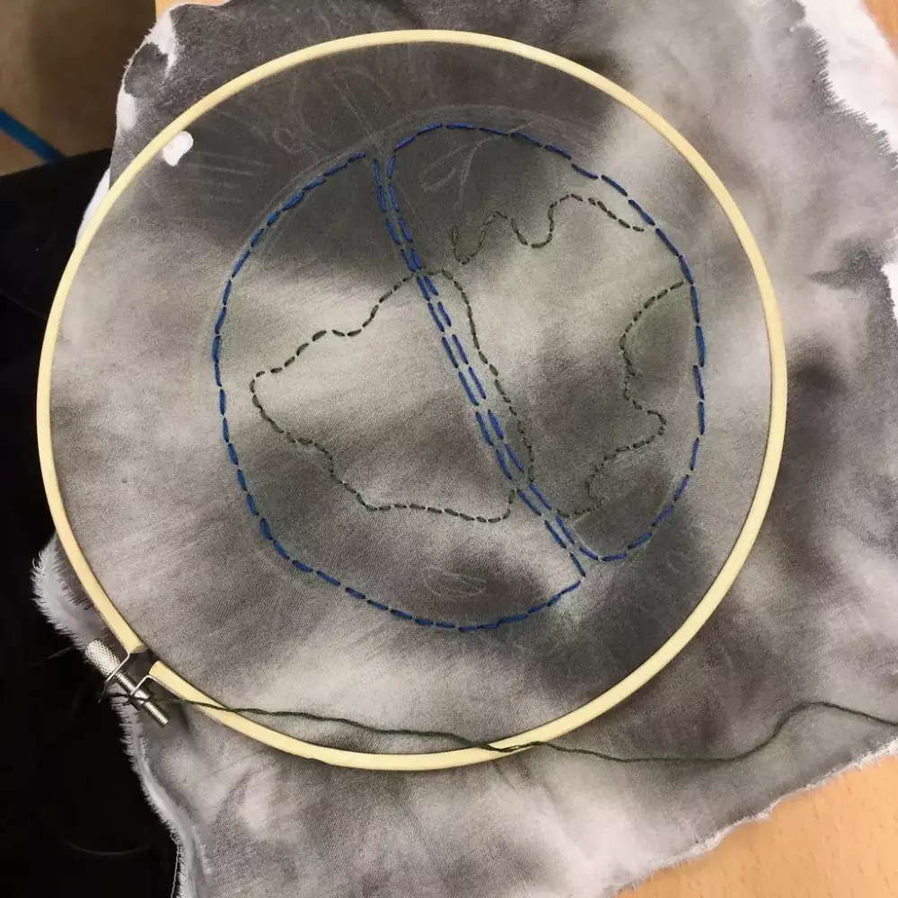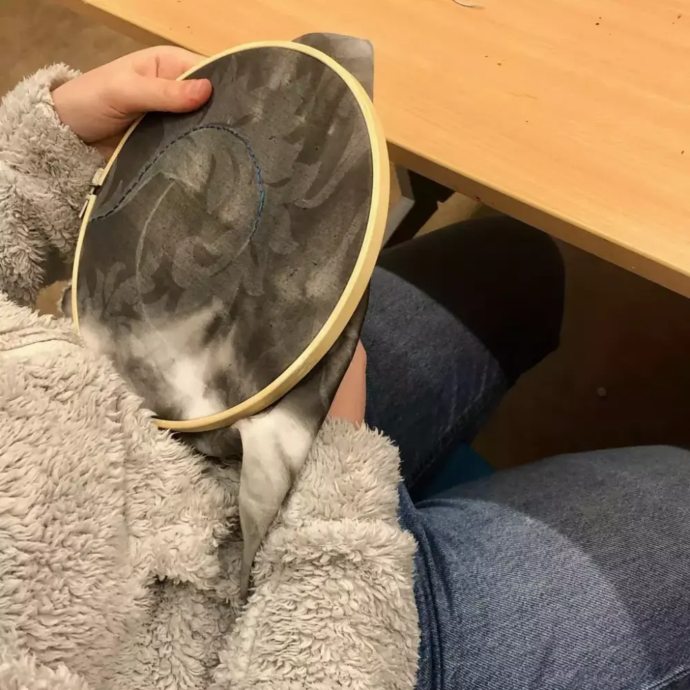 Elevene gikk i gang med å brodere sine motiv med bruk av attersting. En langsom teknikk som tar tid. De enkle, fargerike og skjøre broderiene står i sterk kontrast til den sorte tekstilen.